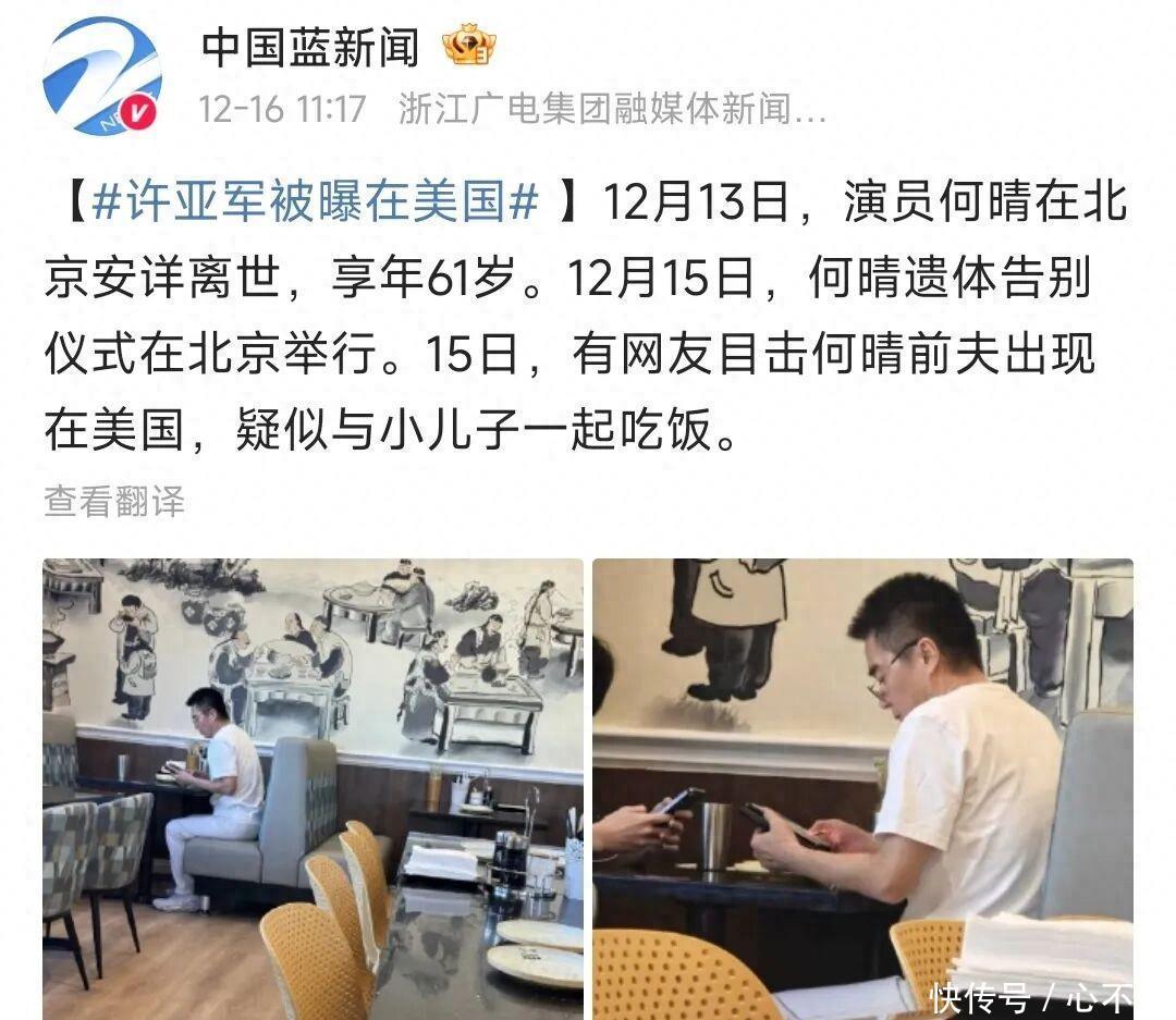 争议核心:缺席,一个无可辩驳的事实这场争议的背景,令人唏嘘。2025年12月13日,饰演过秦可卿、小乔等无数经典角色的何晴,因脑瘤离世,享年61岁。3天后,她的告别仪式在北京举行。然而,就在仪式前一天(12月15日),有网友在美国餐馆偶遇了许亚军,他正陪伴小儿子用餐,其社交账号IP也显示在美国。从时间与地理上看,他确实大概率缺席了这场最后的告别。在生死离别这样极具仪式感的时刻,公众对于“曾经的爱人”之间应有的情感联结,抱有天然的、深厚的期待。因此,许亚军的缺席,瞬间点燃了舆论,使他“尽责父亲”的形象也受到拷问。